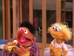 SCENE 2 | Ernie introduces Rubber Duckie three times for the viewer's benefit. He explains to Zoe how much he loves Rubber Duckie, and how he squeaks every time he squeezes him. Ernie demonstrates several times when all of a sudden, Rubber Duckie stops squeaking! |
