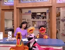 Muppets | Journey to Ernie Big Bird sets off on a Journey To Ernie, heading in the direction of the gate... (First: Episode 3982) ... and arrives on a farm with a cartoon chicken coop. He notices that one of the four chickens is not sitting on an egg... it's one of Ernie's boxes! (First: Episode 3984) |