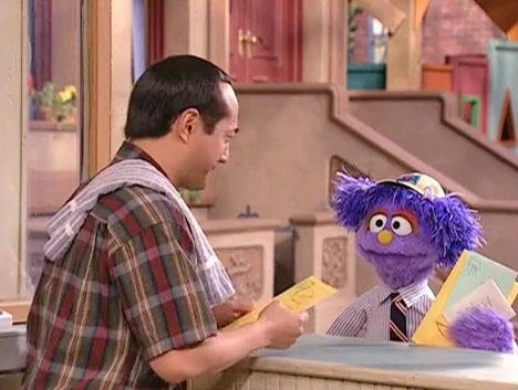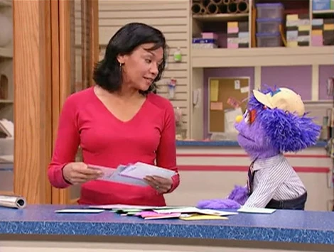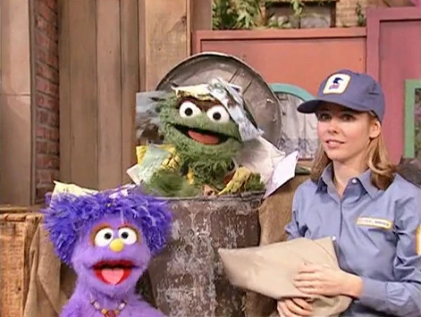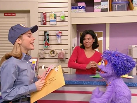 SCENE 2 cont'd | Lulu breathlessly tells Ms. Camp how she wants to be a letter carrier just like her. Ms. Camp is impressed with Lulu's enthusiasm, and she lets her tag along as she delivers mail all over Sesame Street. A montage follows of the two at work, giving Alan an extra-long package at Hooper's Store, Ms. Camp helping Lulu put some letters in the 123 Sesame Street mailbox, and dumping junk mail on Oscar. |