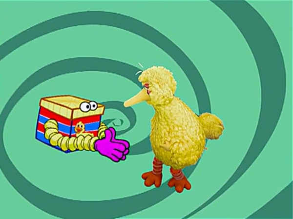 Muppets | Journey to Ernie "Where can that Ernie be?" Big Bird tries going through the gate... (First: Episode 3981) ... where he finds himself in a swirling vortex. A box appears, and Big Bird gets it to open by repeating the clapping pattern it makes. (First: Episode 3984) |