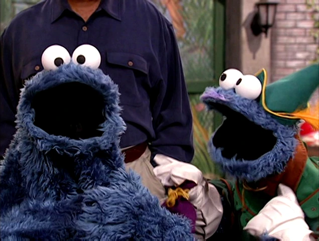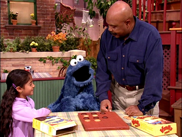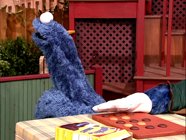 SCENE 1 cont'd | Cookie comes to Gordon and Sidney, who are using some cookies for a game of "Guess What's Next." They run out cookies and head to Hooper's Store to get some more, telling Cookie Monster not to eat their patterns while they're gone. Cookie doesn't notice a mysterious, furry hand swipe all the cookies away. Gordon returns and sees all the cookies gone, then blames Cookie Monster for eating them. Cookie claims he's innocent, but they don't believe him. He smells cookies somewhere else and follows the scent. |
