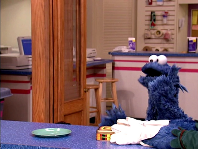 SCENE 1 cont'd | Cookie finds his way to the Mail It Shop, where Maria is sending cookies to her Aunt Rosa in Puerto Rico. She permits Cookie to have one cookie and promises to bake him a batch tomorrow. She looks for a box to ship it in and neither of them notice the same furry hands taking her cookie tin. She also assumes Cookie Monster ate the cookies (including the tin) and forgives him anyway. Cookie Monster walks off hurt. |