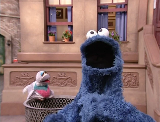 SCENE 3 | Big Bird uses cookies to announce the sponsors, which Cookie Monster eats afterward ("Now that satisfying ending!") |