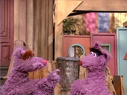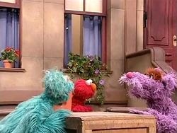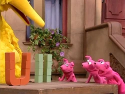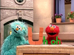 SCENE 1 cont'd | In front of 123 Sesame Street, Elmo and Rosita make a letter U out of blocks and list off some U words; Elmo especially likes the sound of "Ukelele." The Big Bad Wolf barges through in his chase and blows their letter apart. The monsters are very angry, but calm down and start rebuilding their letter. |