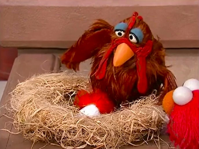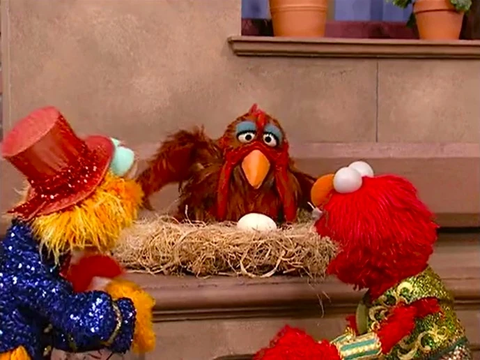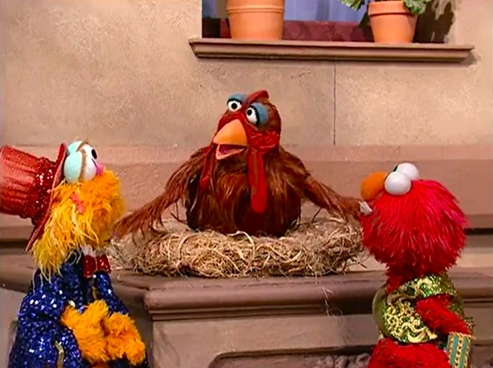 SCENE 1 cont'd | Later, Elmo and Zoe have still not found Rocco. Big Bird notices the sad monsters and learns of their problem. He explains that since he can speak chicken, it’s important to know what she had told them. The three return to the chicken, who according to Big Bird’s translation, hasn’t seen a rock pretending to be a clown. Instead, she saw an egg that fits the description, and reveals she’s been sitting on Rocco all along! Zoe retrieves her rock and the chicken is sad at first until she lays a real egg.
