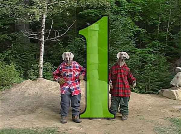 Film | Wegman dogs: Batty and Crooky stack wood blocks to make the number 1. (new graphics) Original version: (First: Episode 4000) cut from the Sprout version, cut from the Max version |