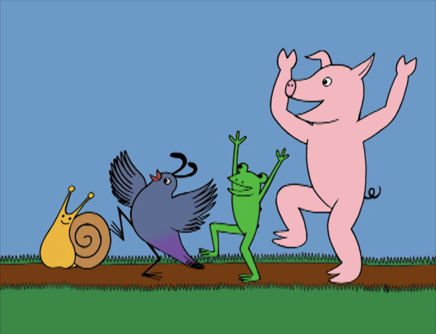 Cartoon | Rhyme Time: Frog and Hog went for a jog. Quail hops and meets a Snail. Artist: Karen Aqua |