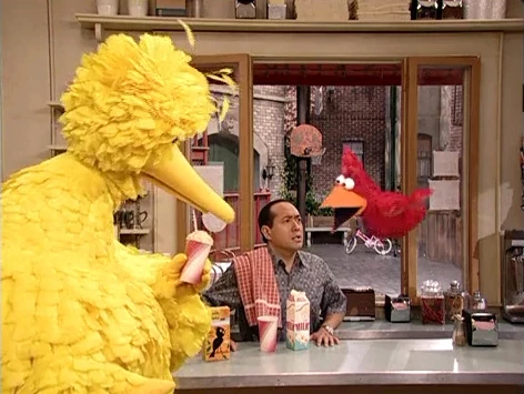 SCENE cont'd | Big Bird enters Hooper's Store and orders two birdseed milkshakes, one for himself and the other for Elmo. Alan assumes Elmo is just pretending to be a bird and is shocked to see his new form gulp down the birdseed milkshake, wondering what his mommy will think about this. Big Bird then invites Elmo-Bird to the Birdketeer meeting. |