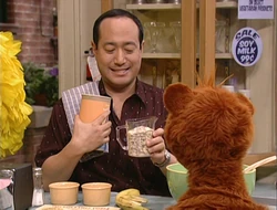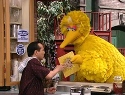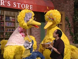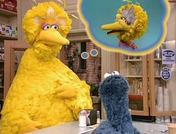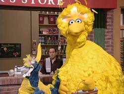 SCENE cont'd | While the cookies begin to sit in the oven, Cookie Monster follows their scent into the store. He is disappointed to find out the cookies are for Granny Bird. Out of "idle curiosity," he asks what she looks like. Big Bird describes her appearance and runs off. Alan brings the cookies out of the oven, when Big Bird hears someone calling him outside. |