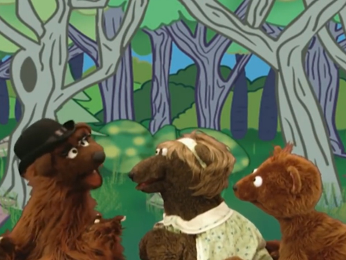 SCENE cont'd | When the Wizard leaves, Papa Bear comments that things are "going to be rough." Suddenly, he turns into a dog. In her comments, Mama Bear says "neigh" (as in no), and turns into a horse. Baby Bear realizes that whenever they make something that sounds like an animal sound, they turn into that animal. To experiment, they all go "oink, oink, oink" and turn into pigs. The Big Bad Wolf happens to be coming along at the time, and tries to capture the three pigs. They quickly growl to turn back into bears, leaving the Wolf to mope away in disappointment. Returning to the Street scene, Baby Bear comments "...and that, my friends, is why you never see me doing animal impressions."