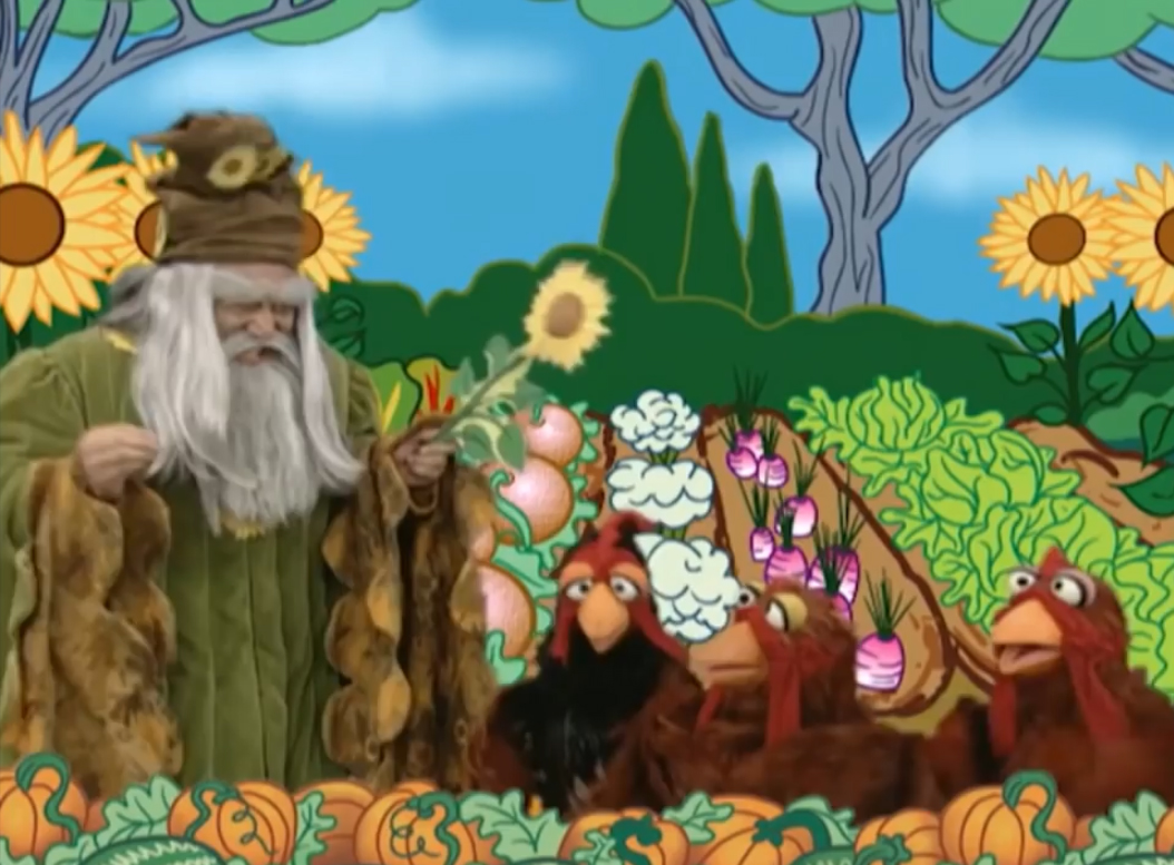 SCENE cont'd | Soon, the Bears get lost in a Wizard's Magic Garden, filled with sunflowers. The white-bearded Wizard (Alan) tells them he will give them something, which Papa Bear suggests might be "a free checking account?" Instead, he places them under a magic spell, turning them to chickens (with Papa Bear as a black feathered rooster). |