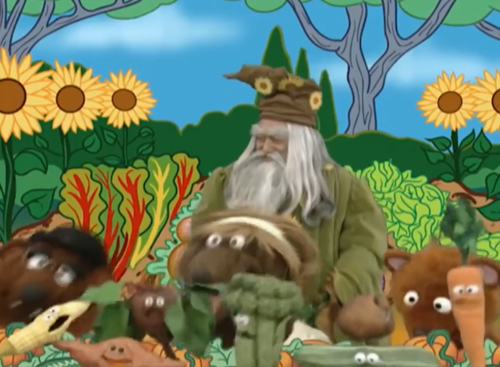 SCENE cont'd | Back in the Wizard's Magic Garden, the Wizard returns with his sunflower-decorated staff. He challenges them to figure out "three things about vegetables", so they can be released from the Garden. After he disappears, vegetables pop out of the bushes, singing "We are the Vegetables and we are tasty too!" When the Wizard returns, he asks for the answers. Papa Bear replies that vegetables are "good for you," Mama Bear replies that they are "delicious," and Baby Bear hesitates, before mentioning that they "are musical!" The Wizard is repulsed by the answer, until Papa Bear gets the yam, corn, carrot, broccoli, cucumber, and other vegetables to come out and sing the song, ensemble, with the Three Bears. |
