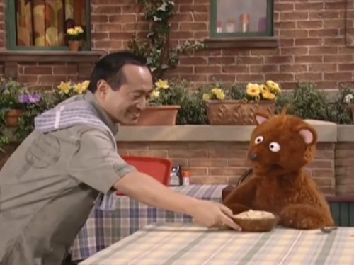SCENE | Alan brings out a bowl of porridge to Baby Bear, who is sitting at a table in the yard. As Baby Bear takes a bite of it, the porridge burns his mouth and Baby Bear quickly takes the spoon out of it. Since it's too hot, Baby Bear decides to wait for the porridge to cool. |