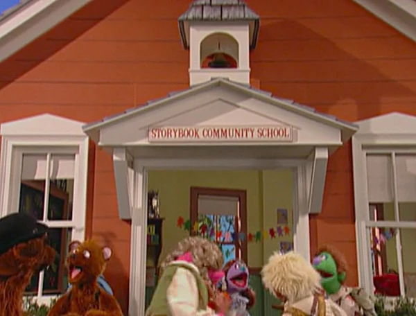 SCENE, cont'd | At the Storybook Community School, the other storybook characters begin to arrive when Baby Bear and Papa Bear get there. Baby Bear recognizes some of the storybook characters, including Hansel and Gretel, Jack and Jill, Little Red Riding Hood, and Mary with her lamb. As the bell rings and the storybook characters enter the school, Papa Bear says it is time for him to say goodbye to Baby Bear. Baby Bear is shocked that Papa Bear is going, but his dad says he's going to have fun at the school. So they both hug and Papa Bear says he'll pick him up after school. |