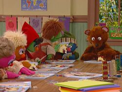 SCENE, cont'd | After finishing their art projects, the storybook characters start working on their Humpty Dumpty puzzles and try to put him back together. Baby Bear puts the final piece together and happily says that he did it. Everyone is impressed at how Baby Bear finished the puzzle, and Baby Bear wishes that his family were there to see this. He starts to think of his family again and wonders what they are doing. He starts to think that going to school will be hard on them. |