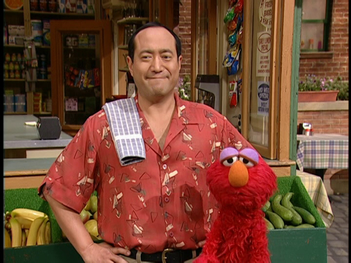 SCENE, cont'd | Maria, Mary's lamb, and a Jitterbug dance to the Jitterbug in the Fix-It Shop, while the customer mentions that he doesn't want his juicer fixed after all. After the troupe jitter out the door, Alan mentions that the letter of the day can sometimes be exhausting. Elmo has fallen asleep in his arms, and they go inside. |