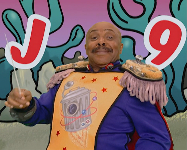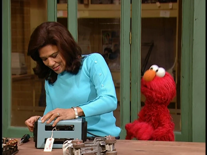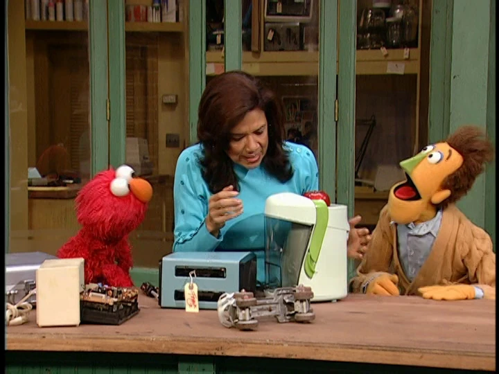 SCENE, cont'd | Jelmo jumps to the Fix-It Shop, where Maria is fixing a toaster (with the label "Frank Oz"). Elmo notes that none of the objects on Maria's table start with "J," and recommends that she fix more items beginning with the letter. |