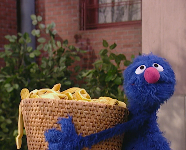 Muppets | Global Grover: Grover returns from Jordan with a basket. In his film, a grandmother teaches her grandchildren to make baskets from banana leaves. Afterward, Grover muses about all the bananas he ate while they made the basket, and slips on the peels! (First: Episode 4058) |