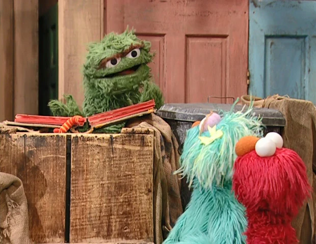 SCENE | After Oscar finishes reading a chapter of Trash Gordon, Rosita and Elmo come by and notice Slimey's enthusiasm. Inspired, Slimey suggests that he wants to be a hero like Trash Gordon. Rosita and Elmo express doubts about the worm's size and strength, but Oscar refutes them. |