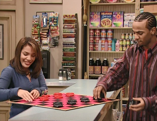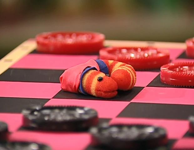 SCENE, cont'd | Afterward, Gabi and Miles engross themselves in a game of checkers, but realize that they're missing a playing piece. The caped Slimey appears and curls up into a checker piece, winning the appreciation of the cast. |