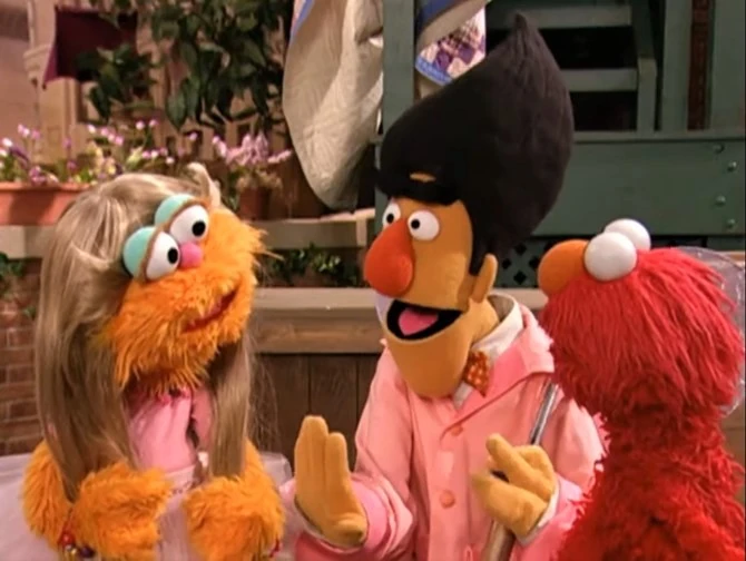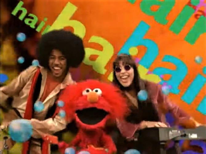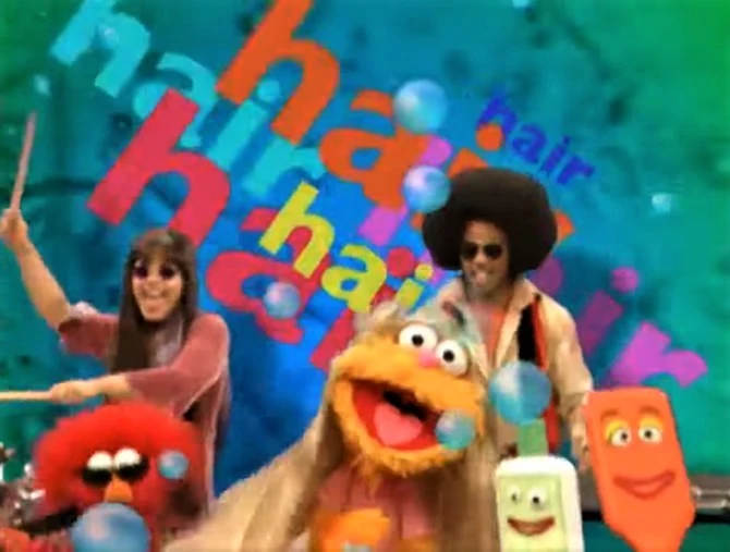 SCENE, cont'd | The scene segues over to a dream-like musical performance of "Take Care of Your Hair" (in a parody of "Hair" from the musical of the same name) with Elmo and Zoe accompanied by brushes, combs, and shampoo bottles. |