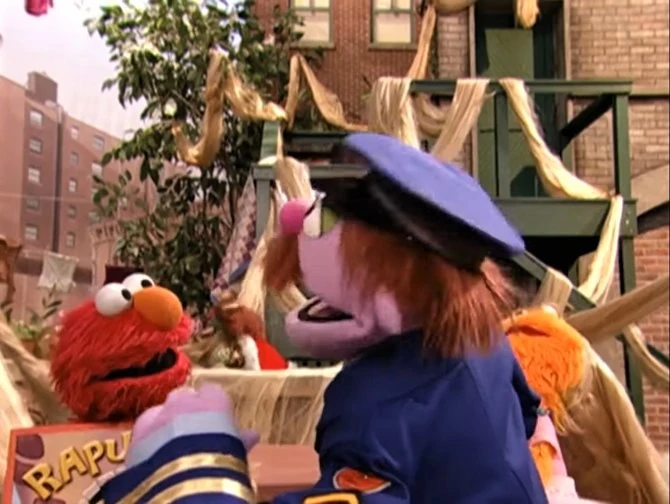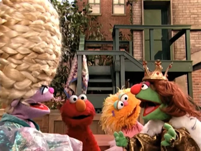 SCENE, cont'd | Zoe tries out different methods of styling her hair. She soon settles on the "Rapunzel" style, with her long strands braided into the letter "R." Her new hairstyle attracts the attention of a nearby prince (Matt Vogel), who begs "Rapunzel" to let down her hair. Elmo intervenes and points out that while Zoe has long hair, Rapunzel's hair is longer. |