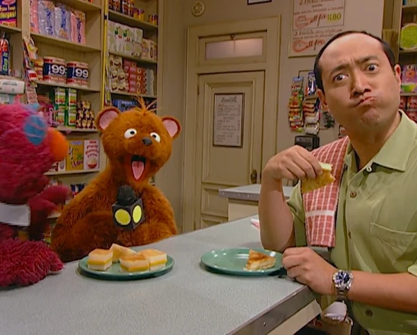 SCENE | Alan welcomes the viewer to Sesame Street. Baby Bear sits at the counter of Hooper's Store and asks for a dish of porridge with brown sugar and honey; his usual treat. At that moment Telly, Monster on the Spot reporter, walks in and announces the day's event: It's National Try a New Food Day on Sesame Street! |