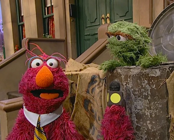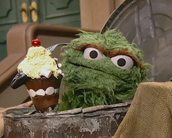 SCENE, cont'd | Oscar the Grouch is Telly's next interview subject. Oscar neither cares about the event nor for Telly's food suggestions, but notes that he's never had a cherry on top of his chocolate ice cream with fish, sauerkraut, and marshmallows before. With that in mind he disappears into his trash can, prepares the delicacy, and loves how terrible it tastes. |