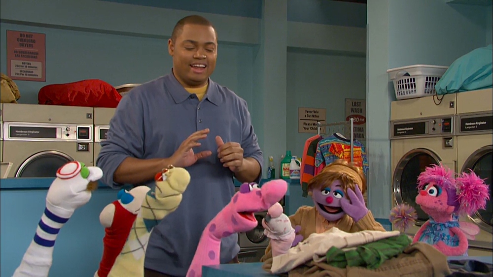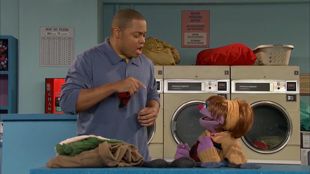 SCENE 1 | At the new Sesame Street laundromat, Chris welcomes the viewer as he does his laundry. He says he loves the noises the washing machines make (singing a variation of "The Wheels on the Bus"), while an Anything Muppet lady disagrees with him. |