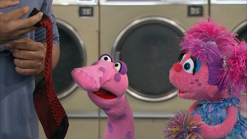 He folds his clothes, then notices he's got one missing sock (all the rest of his socks are in pairs). He wonders where his sock went, when Abby Cadabby poofs into view. He shows her the one sock he has which is missing its match, and she proceeds to show him the trick she was going to show Elmo: her "Two Trick," which involves turning one thing into two. With a spell, a talking sock appears, but it doesn't look anything like Chris' striped sock - this one has polka dots and is pink. |