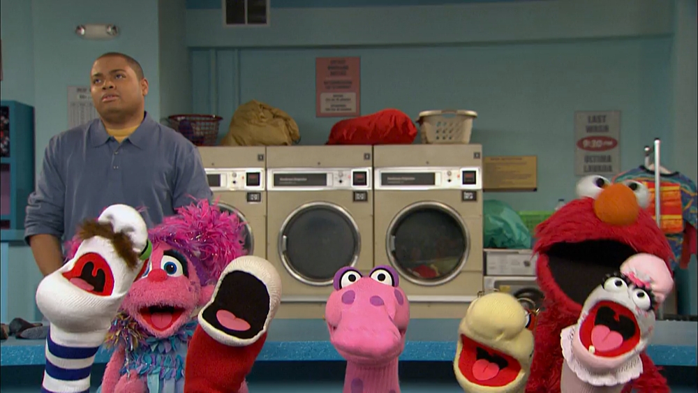 The talking sock decides to take a dip in the "pool" (a washing machine), and Abby tries another trick, the "More Trick," which will make more socks. With more poofs, a Scottish-accented argyle sock appears, then a gym sock, then a baseball sock, and finally a baby sock. The five talking socks start running amok around the laundromat, confusing Chris. Elmo comes into the laundromat and joins Abby and the socks in doing the "Five Sock Conga." |