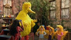 She overhears Big Bird having a meeting with the Birdketeers, who flap their wings as they sing the alphabet song. Once Leela gets there, she asks them to do it again, but halfway through the second time, the cuckoo clock chimes, which means the meeting is over. |