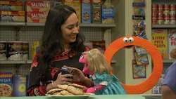 Next, she goes over to Hooper's Store, where Alan finishes serving fresh-baked cookies to Prairie Dawn, which she wants to share with her friend, a letter O. Prairie suggests that the O could be in Leela's video, and they look for something that starts with O. Once they observe the oatmeal cookies, Cookie Monster pops up and devours them ("Me compliments to the chef!"), then chases after the O, thinking it's a cookie. Leela didn't have a chance to get either of them on camera, so she moves on to look for something else to show her parents. |