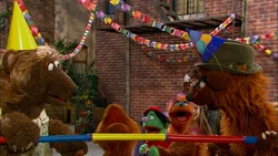 Some guests arrive with presents for Baby Bear, and the party is ready to begin! The first game they play is limbo, but after Telly goes under the stick, Curly tries to get the cake, and Telly immediately stops her in her tracks, but accidentally breaks the stick when he does so. Baby Bear isn't angry that the stick is broken; he's just glad the cake is safe. |