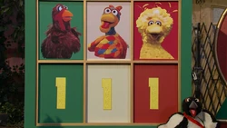 SCENE | Chris and Alan close Hooper's Store, welcome the viewer and plan on going bowling. However, their plans are put on hold when they hear a fanfare and Big Bird shows up, announcing the "Sesame Street Bird Games" and tells them they're the judges. A penguin adviser arrives and hands Alan an envelope with the game's rules. He also gives them their judicial headgear. Alan questions why they must do it and Big Bird points out that it will be fair if non-birds judge the events. The other two contestants arrive (a chicken and a duck), so the games can now commence! |