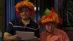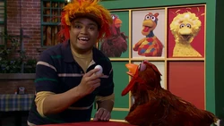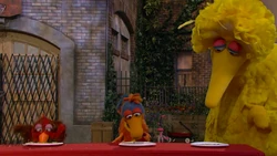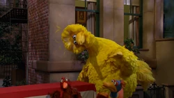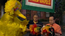 SCENE cont'd | For the tie-breaker event, the trio must each do an interpretive dance that express what it's like to be a bird. The chicken dances as if she's laying an egg, the duck dances as if he's swimming and Big Bird sways to and fro to express his "inner birdness." The judges decide that since they all danced so well, they crown all of them winner! Alan and Chris leave to go bowling as the birds share the grand prize – 10 pounds of birdseed! |