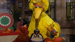 SCENE cont'd | The next game is the "30-Second Egg Lay." The penguin drags out a clock. Big Bird and the duck are males, thus they cannot lay eggs, but the rules say they are not exempt. Big Bird tries to buy one, but the rules do not permit it. The duck tries to pass off an apple as an egg, but denied. The thirty seconds are up and the chicken lays an egg, giving her a point! |