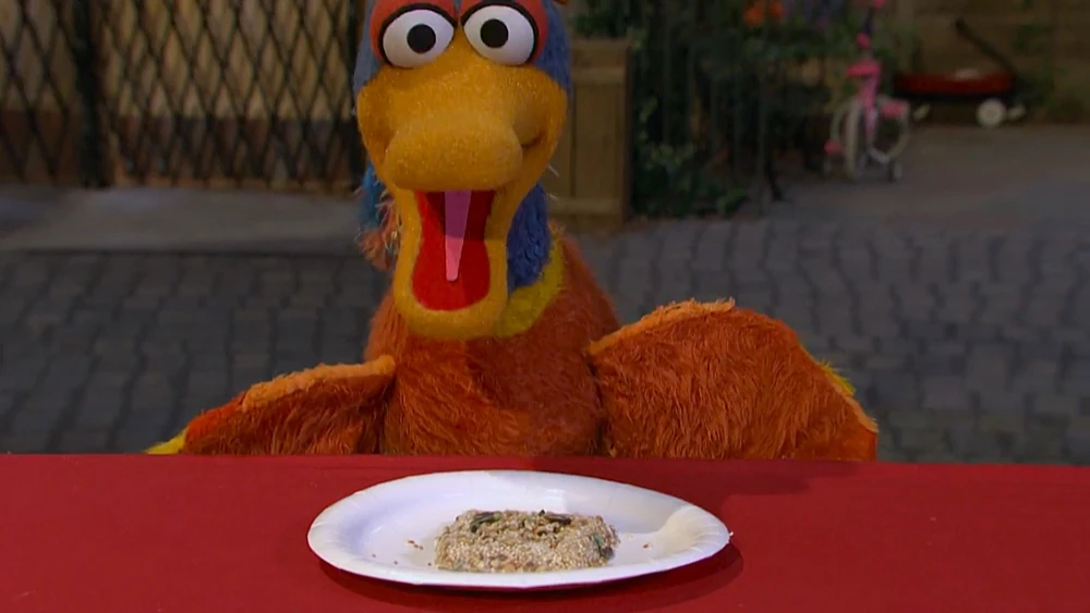 SCENE cont'd | The first event is "The Square-Meal Peck." A dish of birdseed is placed in front of the birds and they must peck the birdseed into a square. The chicken begins pecking wildly, the duck carefully pecks his food and Big Bird takes one look at his plate and devours it in hunger. Time's up! Big Bird and the chicken have no square-shaped birdseed to present, but the duck has a perfect square, earning him a point. The duck begins to eat his square and Big Bird sighs, "If I only waited." |
