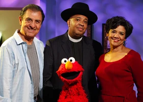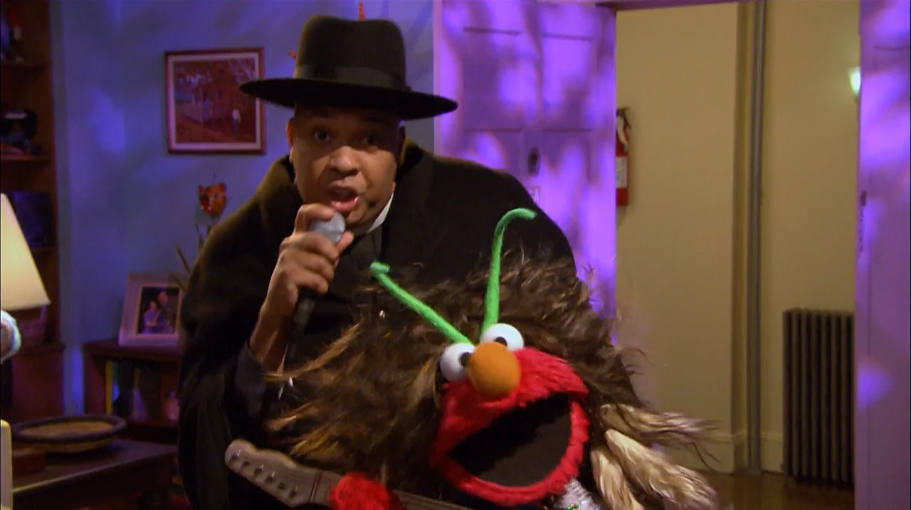 SCENE cont'd | Maria and Luis don't know how they can lure the bug out of the apartment. Elmo has an idea... He runs out and re-appears in costume, singing "Hop This Way" with Rev Run. The grasshopper, Luis and Maria follow them out of the building. |
