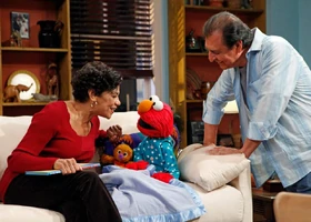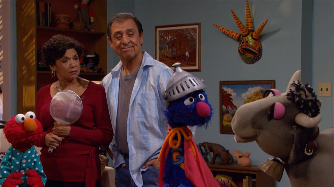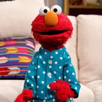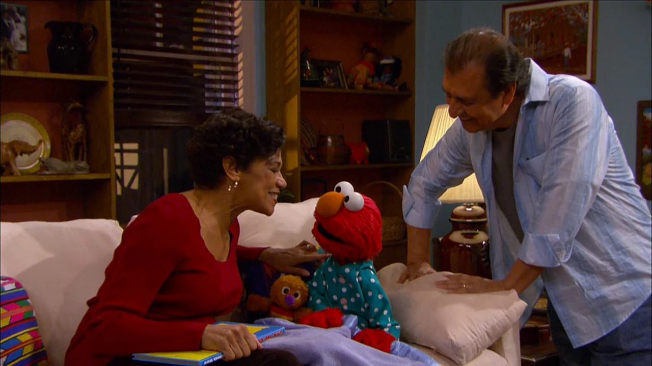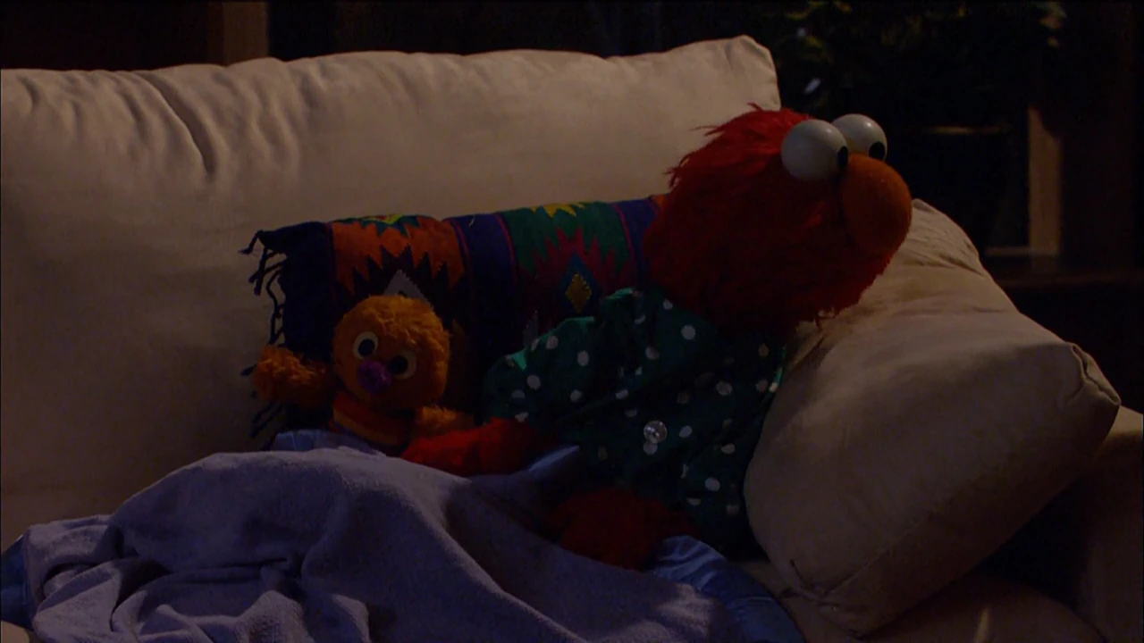 SCENE | Elmo is sleeping over at Maria and Luis' apartment. When Elmo tries to sleep, he hears a strange noise. He calls them in, but the sounds stop when they listen. Elmo hears it again when they leave. Maria points out Mrs. Mazzarino's cat on the fire escape and claims that's what he heard, when the noise happens again. They run all over the room trying to find the source. |