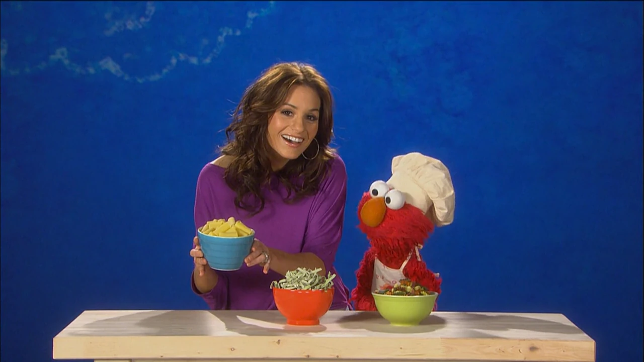Muppets / Celebrity | Kara DioGuardi and Chef Elmo show the various kinds of pasta. |