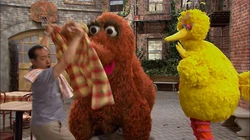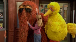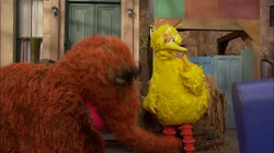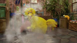 SCENE cont'd | Gina comes by to pick up her laundry and finds it all over the place. Leela returns to work while Gina inspects what's wrong with Snuffy. Big Bird thinks he's allergic to the laundry detergent bottle, but nothing happens when they hold it to him. Gina notices Snuffy starts sneezing when Big Bird gets close and experiments. She takes him far from Snuffy, who ceases sneezing. After doing it a couple times, Big Bird gets the hint that Snuffy's allergic to him. They fear they can't be friends anymore, until Gina notices the dust coming off of Big Bird. She deduces it must the dust from his dust bath that's making him sneeze. Snuffy lets out a final sneeze, that blows the dust off of him. They cheer and reunite. |