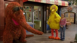 SCENE cont'd | Snuffy is waiting outside for Bird. When they get close to each other, Snuffy begins sneezing violently, sending the lamppost and mailbox hurdling away. Big Bird suspects something around there is making him sneeze and suggests they go to Hooper's Store instead. |