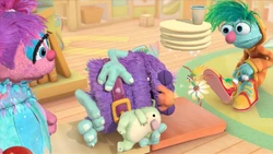 SCENE cont'd | Two pigs are endlessly playing "Rock-paper-scissors" (and tying at "paper") by Oscar's can, bothering him. The A Team attempts to distract the pigs with some A words. Abby conjures up Alan in a rainbow afro, who is then chased by an alligator with an attitude, neither of which help the situation. Big A introduces the "long A" sound and brings in an ape-angel who sings about acorns. Nothing happens once more. Alan returns the afro to the alligator and suggests they ask the pigs to stop. They do so and the pigs halt. Oscar is glad they're done, but is irritated when the A Team begins singing their celebratory theme song, driving him back into his can. |