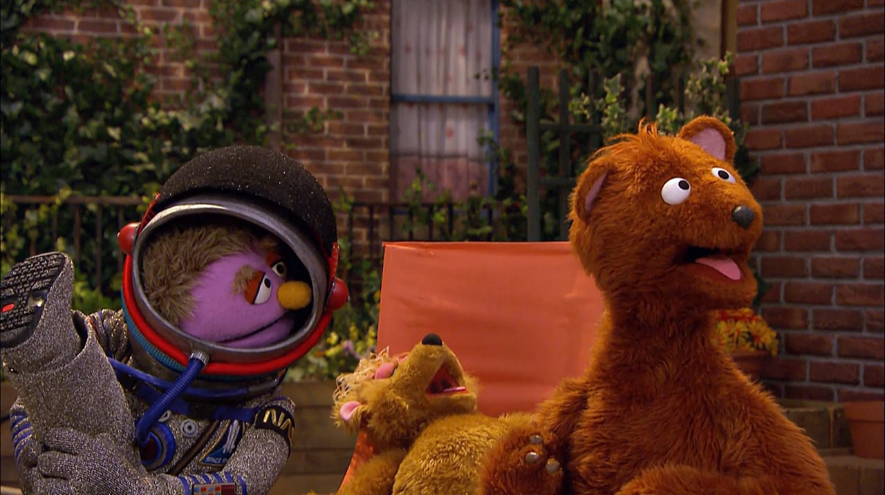 SCENE cont'd | Baby Bear is trying to get Curly Bear to take her nap, but she refuses. The A Team arrives and brings in the solution - an astronaut doing aerobics while saying the alphabet. Baby Bear doesn't believe it will work, but afterward, Curly plops into her seat and naps. Baby Bear thanks them, when they hear another A-sound cry of distress. |