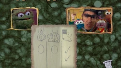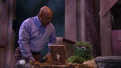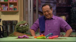 SCENE | At night, Gordon welcomes the viewer while delivering some trash to Oscar the Grouch. He finds him at his trash can on his laptop, about to take an online course in Grouchology from P.U. (Putrid University). On the video feed, some Pesties introduce star teacher Nikola Messla and they sing their school song. Professor Messla gives Oscar's his first Grouchology question to answer - what do worms like to squirm on best? To find the answer, he must set up a Grouch experiment while obeying three rules - he must observe the worms, record his findings and, most importantly, annoy someone in the process. Oscar is ready to start some science and goes off to experiment. |