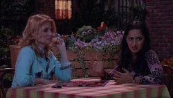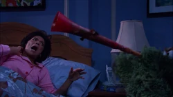 SCENE cont'd | Oscar appears in their bedroom and starts rattling cans. The noise wakes up a confused Maria, but not Luis. Oscar starts a "Grouch vuvuzela solo," which once again only wakes Maria and makes her angry. She yells at him so loudly, Luis is woken up. Oscar records this on his notepad and leaves. Luis doesn't understand what's happening and Maria tells him she'll explain in the morning. |