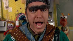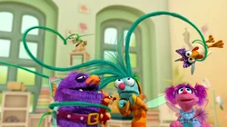 Muppets / Animation | Abby's Flying Fairy School Today is Picture Day, and all the students have made themselves up nice, except for Gonnigan, who's having a bad hair day. Abby conjures up some "Rapunzel-Brand Hair Gel" and, because he has so much hair, uses the whole container on him. While it makes a suave hairdo at first, it soon begins to grow out of control (while Blögg measures its length using Niblet). Abby tries using a baret and Blögg uses a stove-pipe hat to control his hair, but it ends up getting even longer and grabbing hold of everyone. After a twinkle-think, Abby conjures up Papino the Pixie, a barber who cuts his hair to normal length and the class takes their picture. |