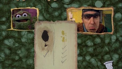 SCENE cont'd | At Hooper's Store, Alan is closing up shop, when Oscar appears to conduct his experiment. He covers the clean counter with coffee grounds and olive oil and Alan begrudgingly lets Oscar proceed ("Future Grouch generations will thank you, Alan!"). Some worms appear and start to squirm in the oil, while one worm goes with the coffee grounds. Oscar records this on his Grouch notepad and abandons Alan with the worms and the mess. |
