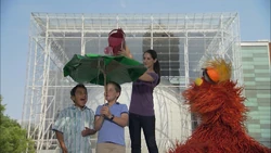 Muppets | With a 100% chance of "Elmo's World" on the way, Murray and the kids start to test their umbrellas. Most of the materials work, except for the cotton. Murray tests his umbrella and gets wet. |